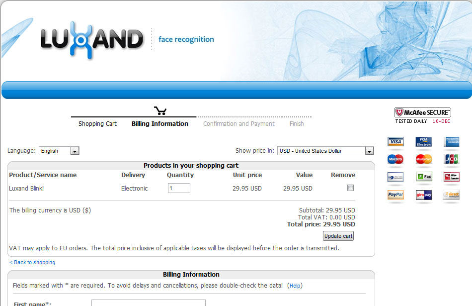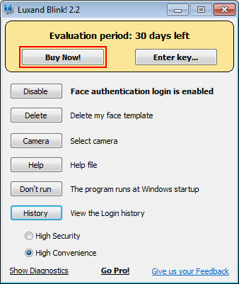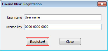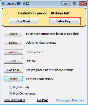 To register Luxand Blink!, you need to enter your user name and the license key that was sent to you by email. In the Settings window, click Enter key....