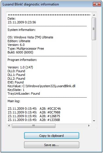 In the resulting window, click Copy to clipboard to copy data required for analysis to the clipboard. Paste this information into an email message and send it to support@luxand.com. Or click Save as… and attach the saved file to the email.