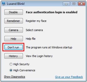 6. If you do not want the program to run at Windows startup, click Don't run. Note, however, that face login remains enabled.