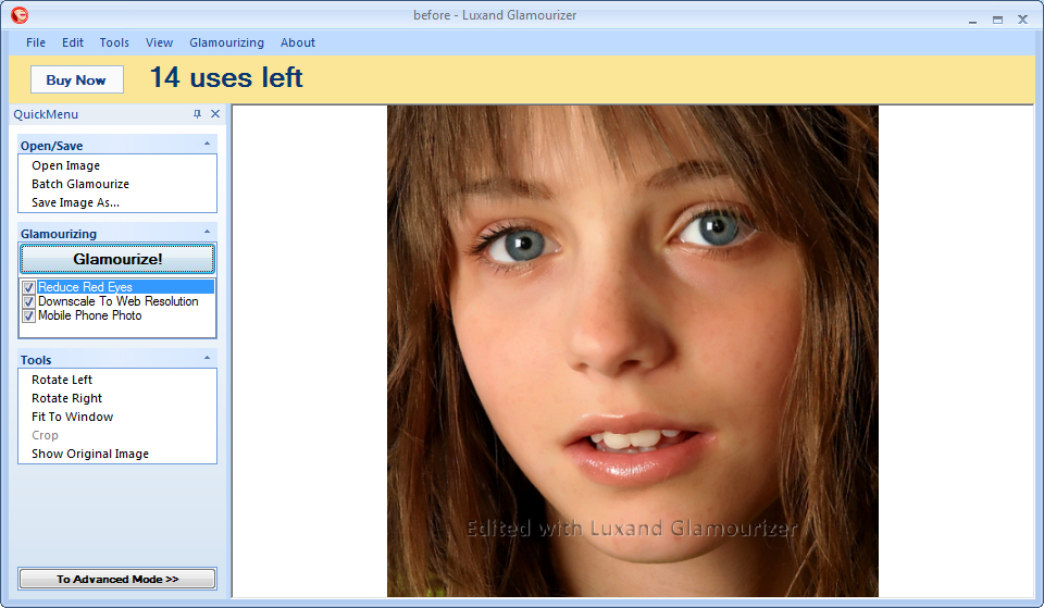 The unregistered version of the software can enhance up to 15 photos. In the trial mode, the program does not save photos and process images in batch mode. Registration removes watermarks and enables the user to save photos and use batch mode.
