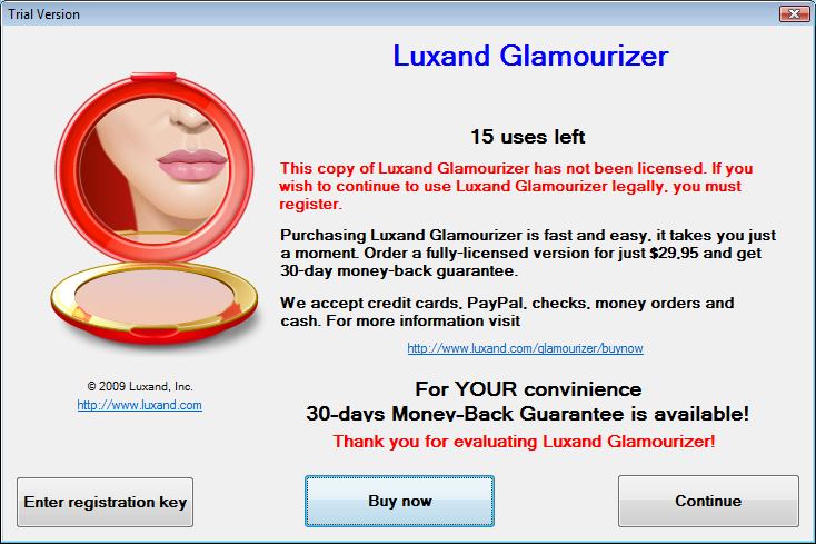 To buy the program, the user needs to have active connection to the Internet. Click on this link: http://luxand.com/glamourizer/buynow or click Buy now in the trial window of the program.